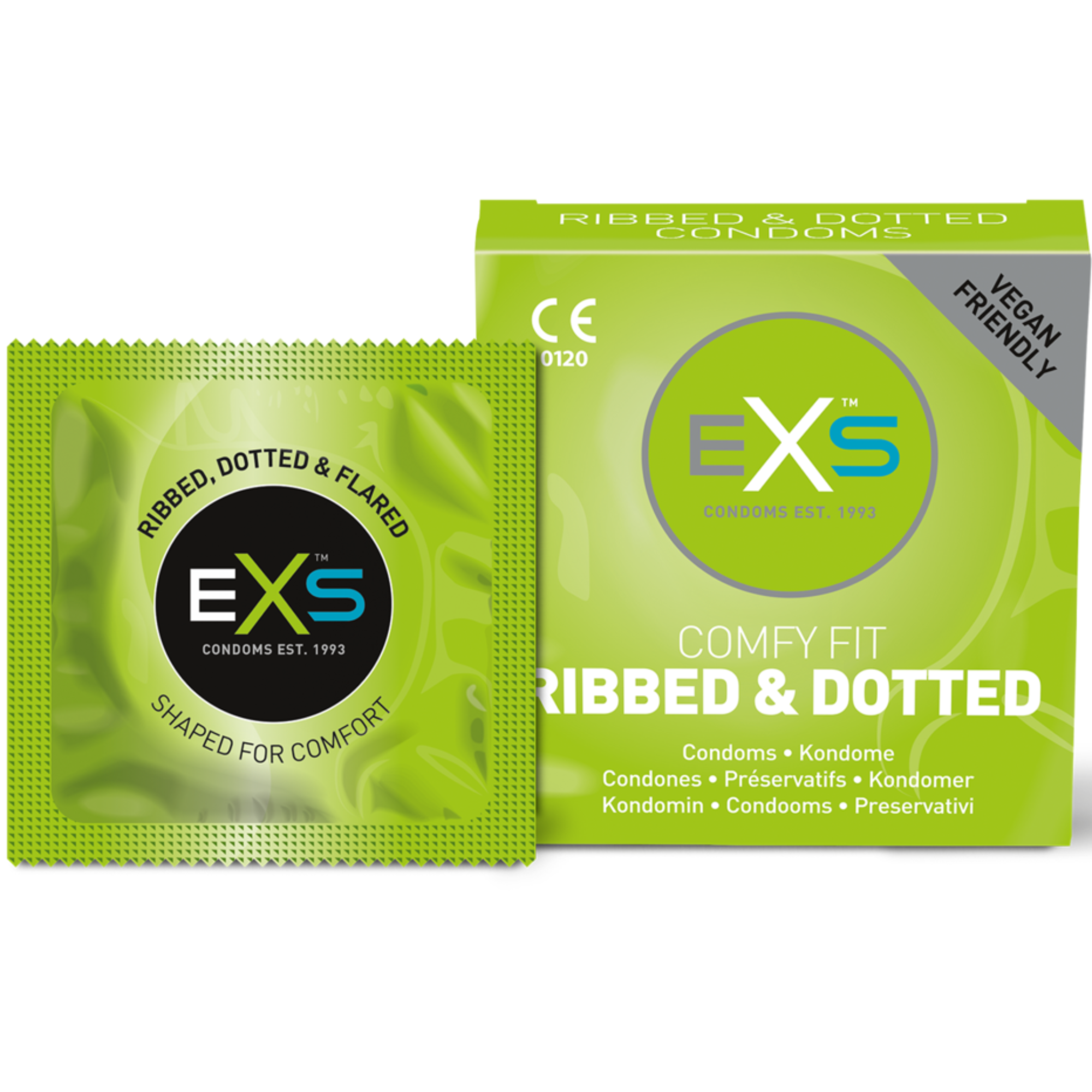 EXS Ribbed & Dotted zaprojektowanym z myślą o intensyfikacji przyjemności dzięki unikalnej prążkowanej fakturze. Specyficznie rozmieszczone prążki oraz wypustki połączone z odpowiednim ukształtowaniem prezerwatywy z rozszerzoną końcówką zapewnią Wam dodatkową rozkosz i maksymalny komfort. Polecane wszystkim, którzy chcą urozmaicić swoje życie seksualne o dodatkowe doznania.